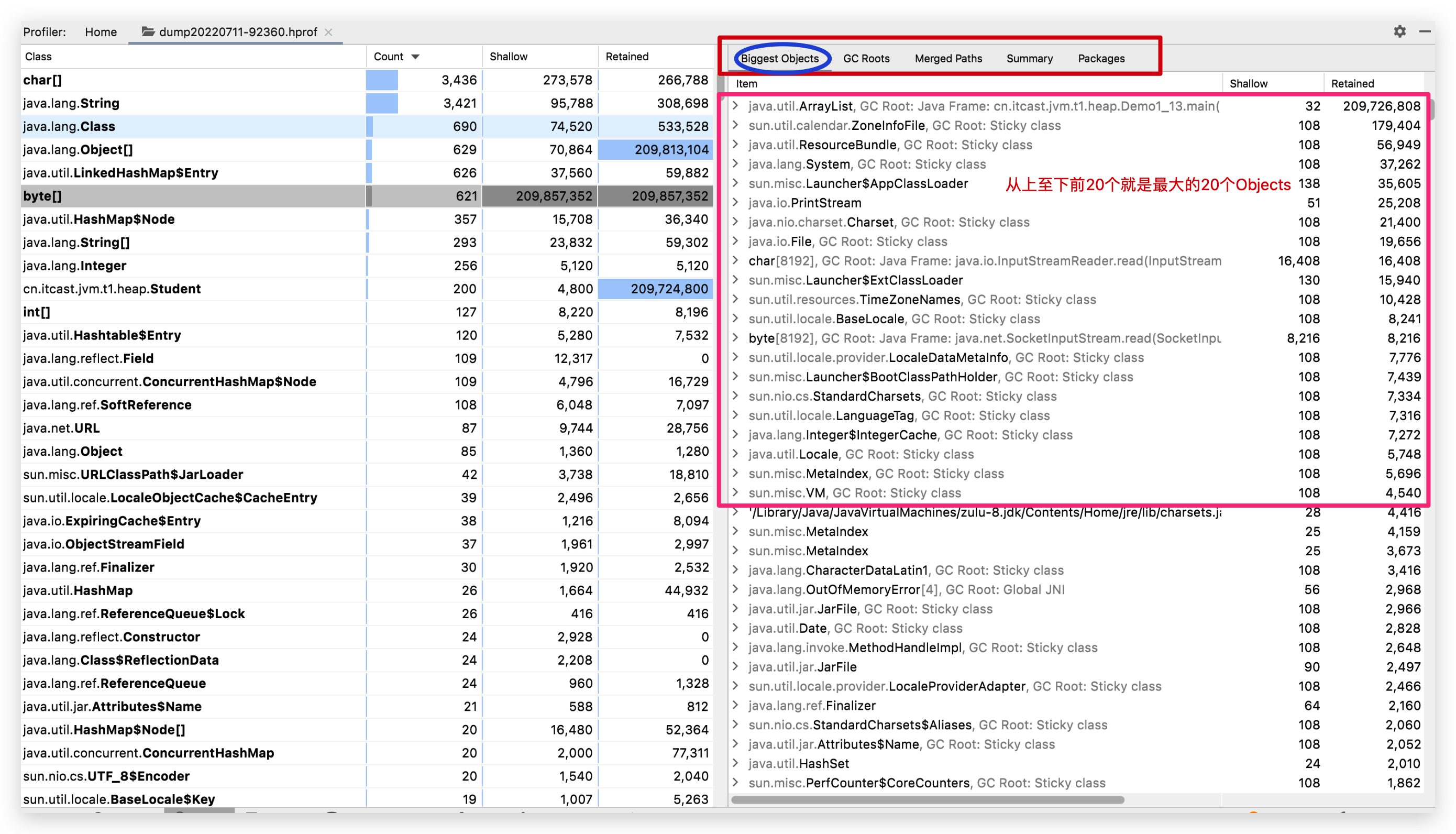 list1 = null前后进行转储文件的导出查看GC Roots. 发现引用置空后Thread类型里main主线程里的ArrayList 行Root没有了.