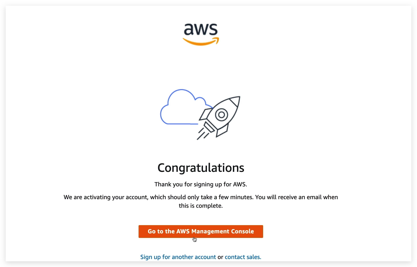 Note: The text might be slightly different for you, but as long as AWS says thank you, or welcome, and tells you to start using your account, it should mean it’s activated.